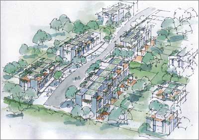 Wir haben versucht einen Grundrisstyp zu entwickeln, der den örtlichen Anforderungen gerecht wird. Der Grundtyp kann verschieden ausgestaltet werden und passt sich so der Lage im Bebauungsgebiet als auch den individuellen Bedürfnissen der Bewohner an.