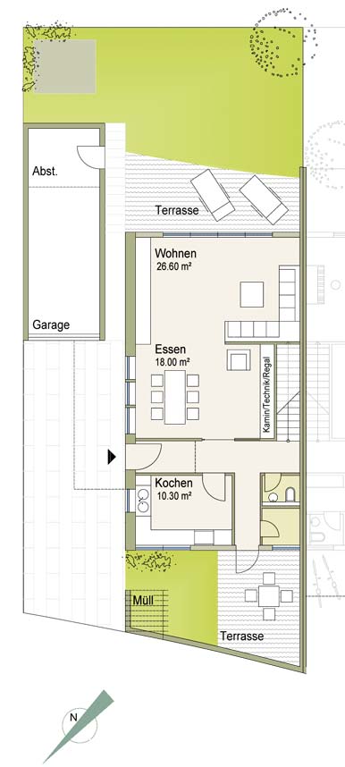 belichtet, liegt der Essplatz. Zum Garten orientiert