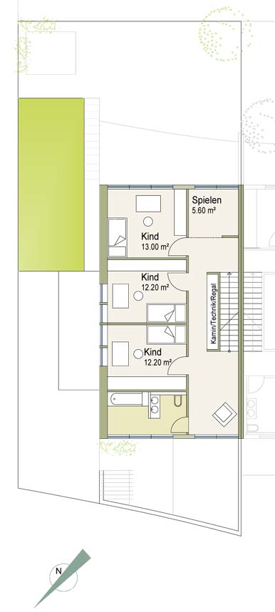 zur Seite und zum Garten orientiert drei Kinderzimmer.