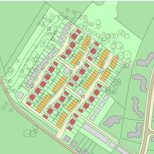 Das Bebauungsgebiet besteht aus Einzel- und Doppelhäusern und Reihenhausgrundstücken.
